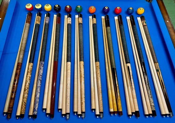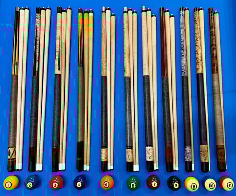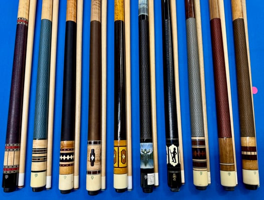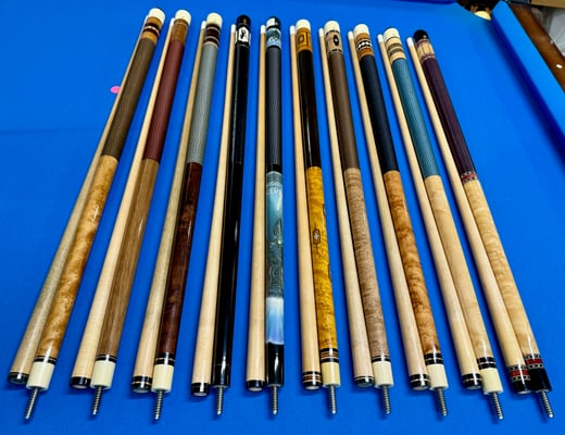 Custom shop made Schuler cue- Shafts have very minimal movement, finish is 9/10, 5/16x14 B- 29" 14.55oz, S1 is 28.75" 4.61oz 13.15mm, S2 is 28.75" 12.35mm 4.16oz $1099 Shipped