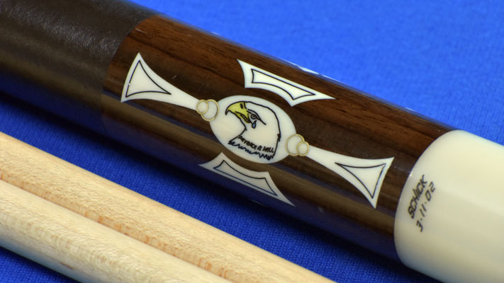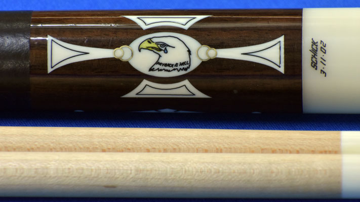 For sale is a VERY interesting patriotic cue by Bill Schick with original scrimshaw artwork. This cue was ordered prior to 9/11/01 and was finished 3/11/02. The gentleman that ordered the cue worked in finance in NYC in the WTC Tower #1. On September 11th, 2001 the owner of this cue was working in Tower #1 of the World Trade Center all the way up on the 83rd floor when the first plane crashed into his tower (tower #1). He was fortunately able to escape the building by foot down 83 flights of stairs. During his escape tower 2 was struck and had fallen while they were going down the flights of stairs which he did not know until he was outside of tower 1. When Bill found out that the customer that ordered this cue had survived September 11th and was able to escape and survive, he added the scrimshaw artwork of the American eagle with a teardrop from its eye with the words "PAYBACK IS HELL" on each side inside the ivory design inlay panel with brass rings on each side as a beautiful gesture to the owner. Please see LOA in the photos for Bill's personal notes on this cue.